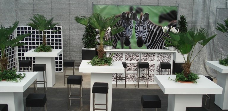 Met ons bamboe-assortiment geeft u uw beursstand een tropisch tintje. Voor een zakelijke sfeer hebben we een divers assortiment, zo kunt u bijvoorbeeld ook zwart-witte statafels of robuuste steigerhouten statafels huren. Een mooie bar, een luxe zithoek en de juiste palmen creëren een ontspannen sfeer, zodat u ontspannen zaken kunt doen.