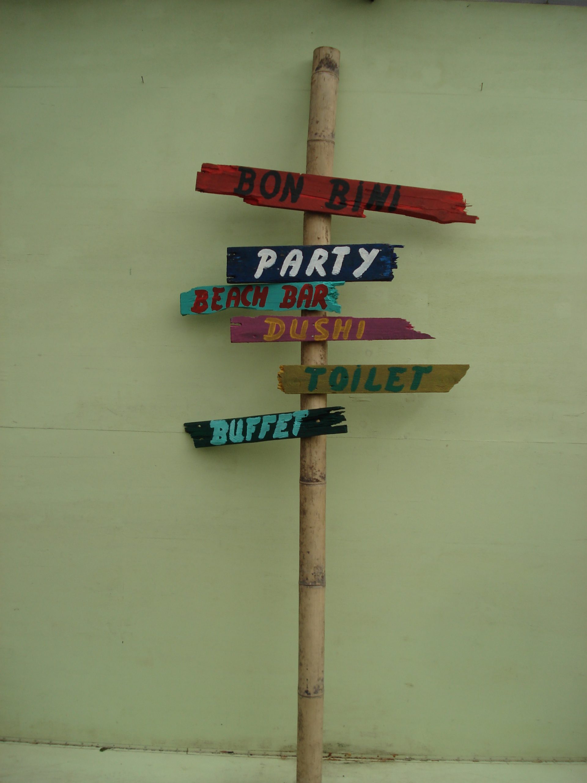 Een bamboepaal met gekleurde borden wijst u de weg naar Bon Bini Beach.