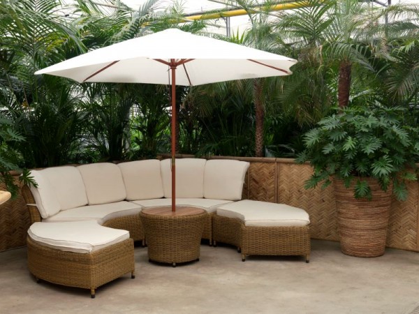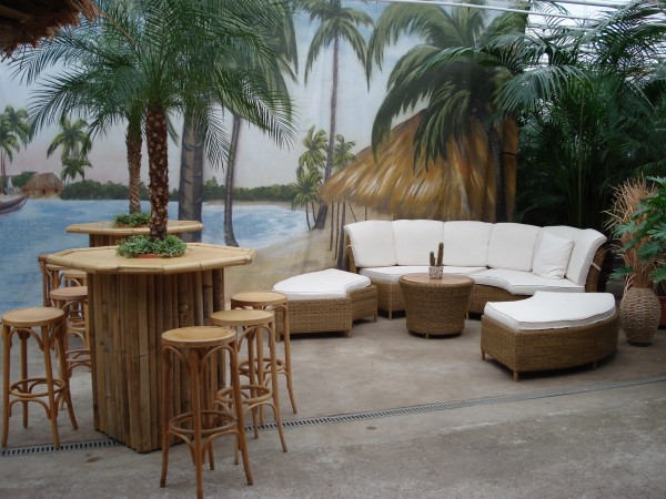 Met onze bamboe loungehoeken, rotan zithoeken en robuuste bamboe statafels – het tafelblad eventueel voorzien van een palm.